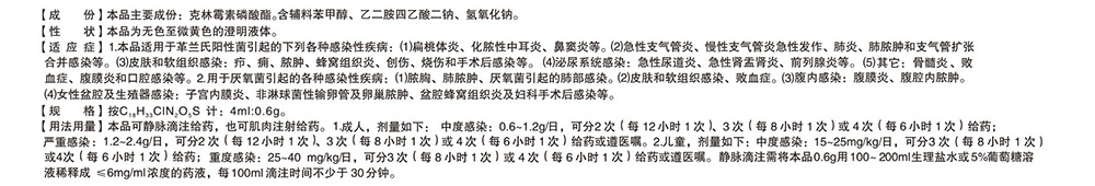 适应症: 1.本品适用于革兰氏阳性菌引起的下列各种感染性疾病:(1)扁桃体炎、化脓性中耳炎、鼻窦炎等。(2)急性支气管炎、慢性支气管炎急性发作、肺炎、肺脓肿和支气管扩合并感染等。(3)皮肤和软组织感染:疖、痈、脓肿、蜂窝组织炎、创伤、烧伤和手术后感染等。(4)泌尿系统感染:急性尿道炎、急性肾盂肾炎、前列腺炎等。(5)其它:骨髓炎、败血症、腹膜炎和口腔感染等。2.用于厌氧菌引起的各种感染性疾病:(1)脓胸、肺脓肿、厌氧菌引起的肺部感染。(2)皮肤和软组织感染、败血症。(3)腹内感染:腹膜炎、腹腔内脓肿。(4)女性盆腔及生殖器感染:子宫内膜炎、非淋球菌性输卵管及卵巢脓肿、盆腔蜂窝组织炎及妇科手术后感染等。