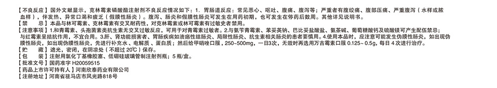 注意事项: 1.和青霉素、头孢菌素类抗生素无交叉过敏反应,可用于对青霉素过敏者。2.与氨苄青霉素、苯妥英钠、巴比妥盐酸盐、氨茶碱、葡萄糖酸钙及硫酸镁可产生配伍禁忌;与红霉素量拮抗作用,不宜合用。3.肝、肾功能损害者、胃肠疾病如溃疡性结肠炎、局限性肠炎、抗生素相关肠炎的患者要慎用。4.使用本品时,应注意可能发生伪膜性肠炎,如出现伪膜性肠炎,先进行补充水、电解质、蛋白质;然后给甲硝唑口服,250-500mg,一日3次,无效时再选用万古霉素口服 0.125-0.5g,每日 4次进行治疗。