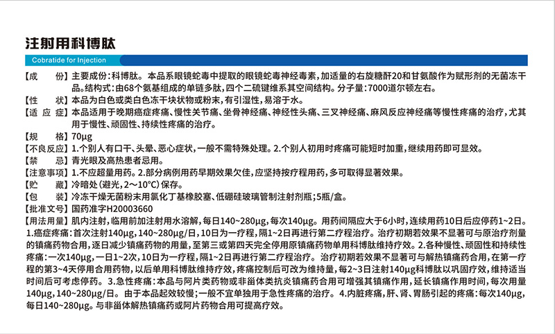 适应症: 本品适用于晚期癌症疼痛、慢性关节痛、坐骨神经痛、神经性头痛、三叉神经痛、麻风反应神经痛等慢性疼痛的治疗,尤其用于慢性、顽固性、持续性疼痛的治疗。