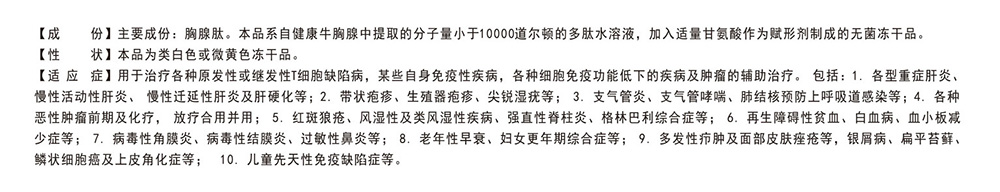 适应症: 用于治疗各种原发性或继发性T细胞缺陷病,某些自身免疫性疾病,各种细胞免疫功能低下的疾病及肿瘤的辅助治疗。包括:1.各型重症肝炎、慢性活动性肝炎、慢性迁延性肝炎及肝硬化等;2 带状疱疹、生殖器疱疹、尖锐湿疣等;3.支气管炎、支气管哮喘、肺结核预防上呼吸道感染等;4.各种恶性肿瘤前期及化疗,放疗合用并用;5.红斑狼疮、风湿性及类风湿性疾病、强直性脊柱炎、格林巴利综合症等;6.再生障碍性贫血、白血病、血小板减少症等;7,病毒性角膜炎、病毒性结膜炎、过敏性鼻炎等;8.老年性早衰、妇女更年期综合症等;9.多发性疖肿及面部皮肤痤疮等,银屑病、扁平苔藓、鳞状细胞癌及上皮角化症等;10.儿童先天性免疫缺陷症等。