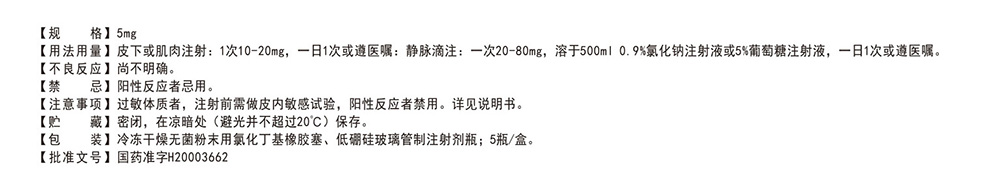 注意事项: 过敏体质者,注射前需做皮内敏感试验,阳性反应者禁用。详见说明书。