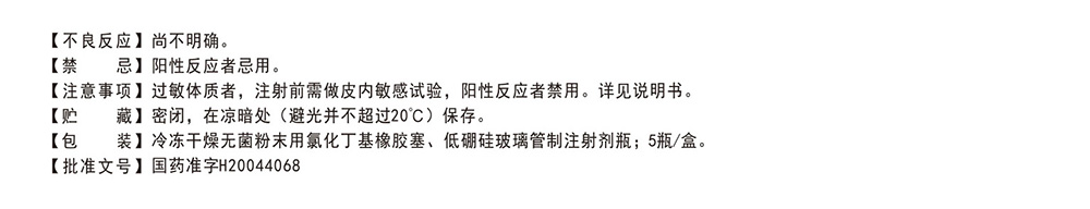 注意事项: 过敏体质者,注射前需做皮内敏感试验,阳性反应者禁用。详见说明书。