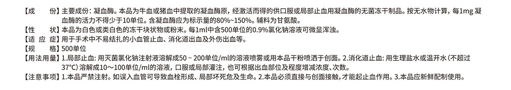 注意事项: 1.本品严禁注射。如误入血管可导致血栓形成、局部坏死危及生命。2.本品必须直接与创面接触,才能起止血作用。3.本品应新鲜配制使用。
