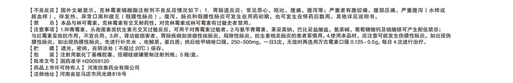 注意事项: 1.和青霉素、头孢菌素类抗生素无交叉过敏反应,可用于对青霉素过敏者。2.与氨苄青霉素、苯妥英钠、巴比妥盐酸盐、氨茶碱、葡萄糖酸钙及硫酸镁可产生配伍禁忌;与红霉素量拮抗作用,不宜合用。3.肝、肾功能损害者、胃肠疾病如溃疡性结肠炎、局限性肠炎、抗生素相关肠炎的患者要慎用。4.使用本品时,应注意可能发生伪膜性肠炎,如出现伪膜性肠炎,先进行补充水、电解质、蛋白质;然后给甲硝唑口服,250-500mg,一日3次,无效时再选用万古霉素口服 0.125-0.5g,每日 4次进行治疗。