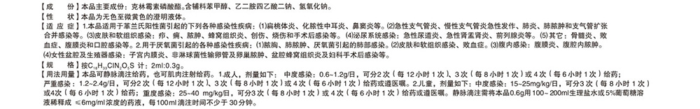 适应症: 1.本品适用于革兰氏阳性菌引起的下列各种感染性疾病:(1)扁桃体炎、化脓性中耳炎、鼻窦炎等。(2)急性支气管炎、慢性支气管炎急性发作、肺炎、肺脓肿和支气管扩合并感染等。(3)皮肤和软组织感染:疖、痈、脓肿、蜂窝组织炎、创伤、烧伤和手术后感染等。(4)泌尿系统感染:急性尿道炎、急性肾盂肾炎、前列腺炎等。(5)其它:骨髓炎、败血症、腹膜炎和口腔感染等。2.用于厌氧菌引起的各种感染性疾病:(1)脓胸、肺脓肿、厌氧菌引起的肺部感染。(2)皮肤和软组织感染、败血症。(3)腹内感染:腹膜炎、腹腔内脓肿。(4)女性盆腔及生殖器感染:子宫内膜炎、非淋球菌性输卵管及卵巢脓肿、盆腔蜂窝组织炎及妇科手术后感染等。
