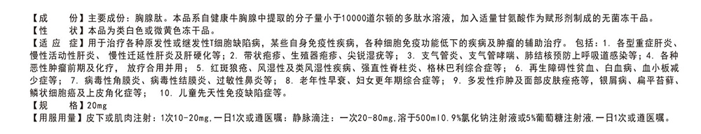 适应症: 用于治疗各种原发性或继发性T细胞缺陷病,某些自身免疫性疾病,各种细胞免疫功能低下的疾病及肿瘤的辅助治疗。包括:1.各型重症肝炎、慢性活动性肝炎、慢性迁延性肝炎及肝硬化等;2 带状疱疹、生殖器疱疹、尖锐湿疣等;3.支气管炎、支气管哮喘、肺结核预防上呼吸道感染等;4.各种恶性肿瘤前期及化疗,放疗合用并用;5.红斑狼疮、风湿性及类风湿性疾病、强直性脊柱炎、格林巴利综合症等;6.再生障碍性贫血、白血病、血小板减少症等;7,病毒性角膜炎、病毒性结膜炎、过敏性鼻炎等;8.老年性早衰、妇女更年期综合症等;9.多发性疖肿及面部皮肤痤疮等,银屑病、扁平苔藓、鳞状细胞癌及上皮角化症等;10.儿童先天性免疫缺陷症等。