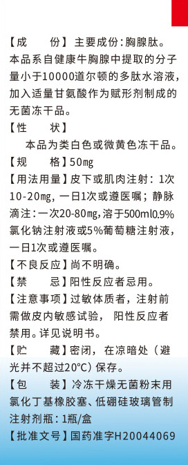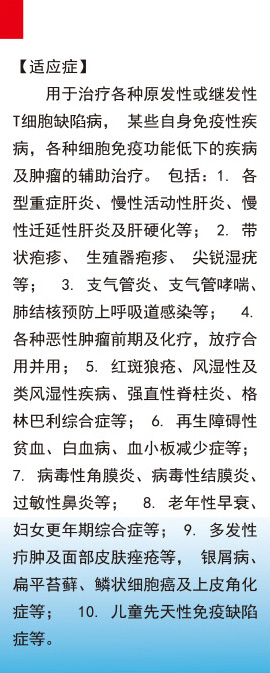 适应症: 用于治疗各种原发性或继发性T细胞缺陷病,某些自身免疫性疾病,各种细胞免疫功能低下的疾病及肿瘤的辅助治疗。包括:1.各型重症肝炎、慢性活动性肝炎、慢性迁延性肝炎及肝硬化等;2 带状疱疹、生殖器疱疹、尖锐湿疣等;3.支气管炎、支气管哮喘、肺结核预防上呼吸道感染等;4.各种恶性肿瘤前期及化疗,放疗合用并用;5.红斑狼疮、风湿性及类风湿性疾病、强直性脊柱炎、格林巴利综合症等;6.再生障碍性贫血、白血病、血小板减少症等;7,病毒性角膜炎、病毒性结膜炎、过敏性鼻炎等;8.老年性早衰、妇女更年期综合症等;9.多发性疖肿及面部皮肤痤疮等,银屑病、扁平苔藓、鳞状细胞癌及上皮角化症等;10.儿童先天性免疫缺陷症等。